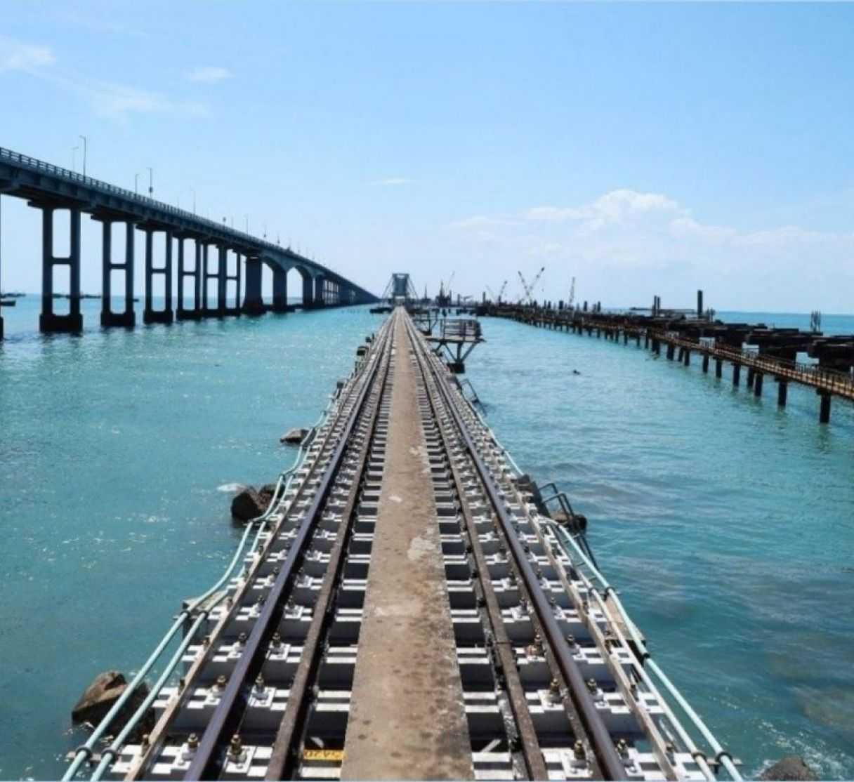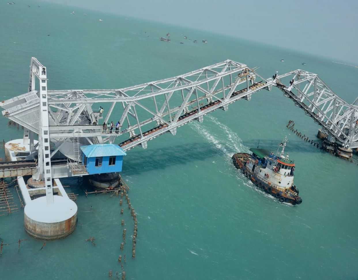 The Pamban Channel, situated between mainland India and Rameswaram Island, is traversed by the impressive 2.3 km long Pamban Bridge. The Pamban Bridge comprises both a cantilever railway bridge and a two-lane road bridge, making it the longest sea bridge in India. The railway bridge spans 6,776 ft (2,065m) and operates as a double-leaf Bascule Bridge. Previously, manual labor was required to open the bridge's two leaves using levers. Every month, over 10 ships, including cargo carriers, coast guard vessels, fishing boats, and oil tankers, pass through the Pamban Bridge.